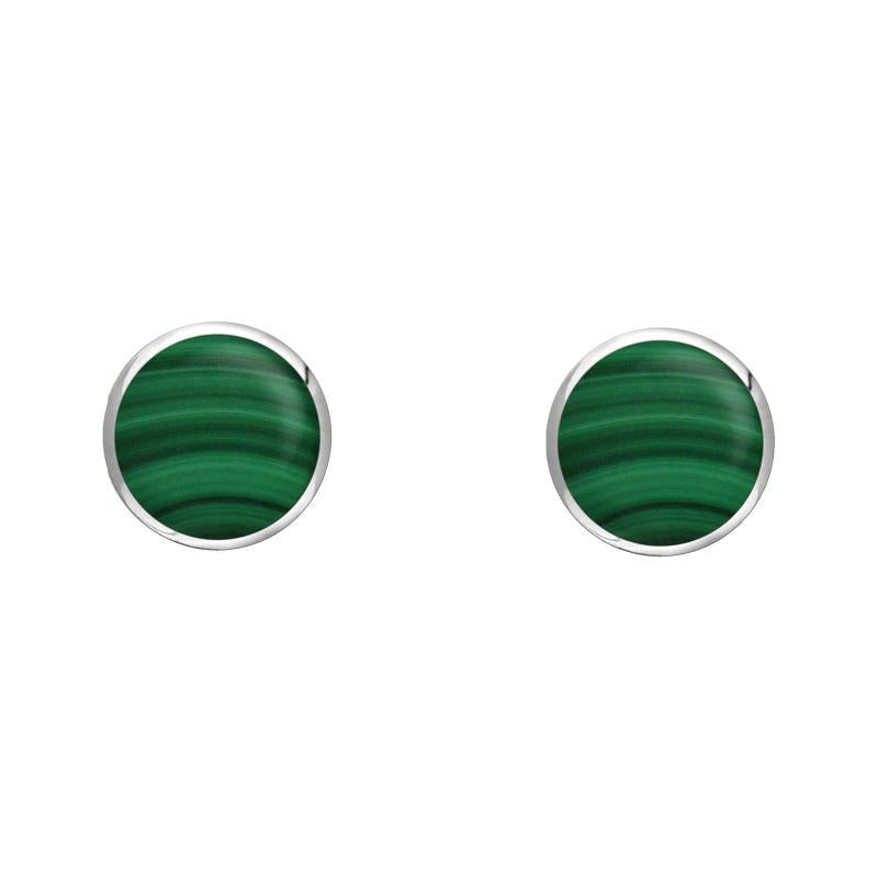 An embodiment of classic style, these sterling silver earrings feature two hand-carved circular cabochons of the finest Malachite stone. The Malachite is elegantly framed in sterling silver and the earrings are completed with secure post and butterfly fastenings, making them perfect for everyday wear.