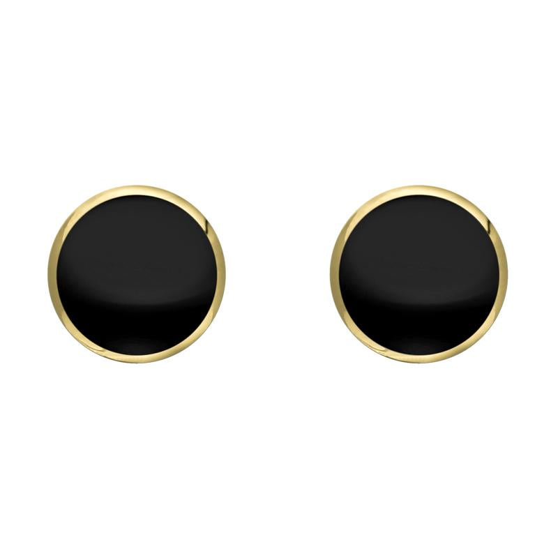 An embodiment of classic style, these 9ct yellow gold earrings feature two hand-carved circular cabochons of the finest Whitby Jet stone, sourced directly from the North East coast of Yorkshire. The Jet is elegantly framed in 9ct yellow gold and the earrings are completed with secure post and butterfly fastenings, making them perfect for everyday wear.