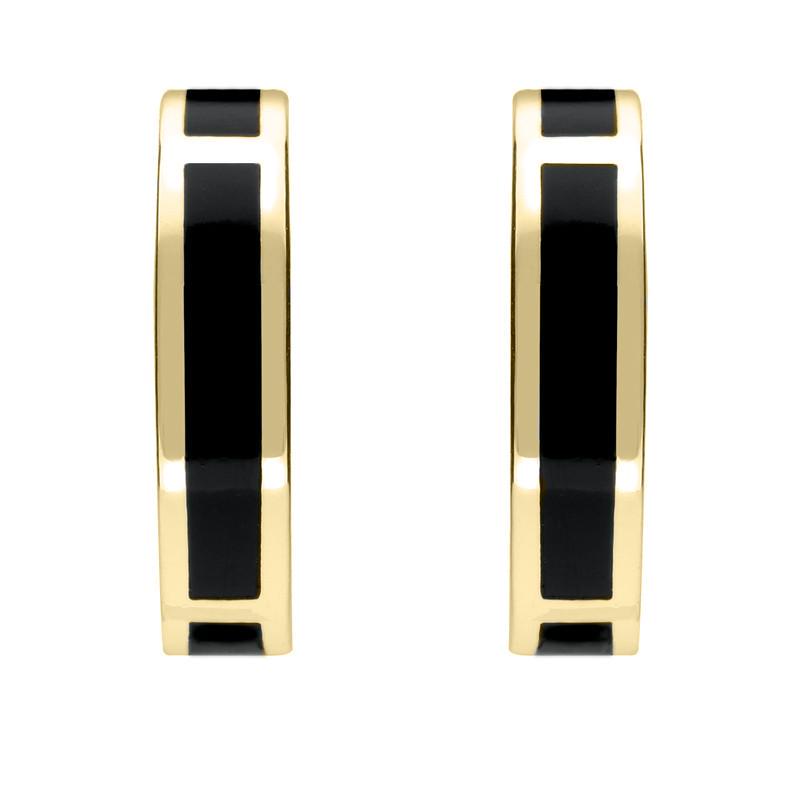 These stunning earrings from the Araucaria Essence collection feature hand carved oblong Whitby Jet gemstones set into three segments within a 9ct yellow gold hoop style stud earring design. A very eye catching and contemporary addition to any jewellery lovers collection.