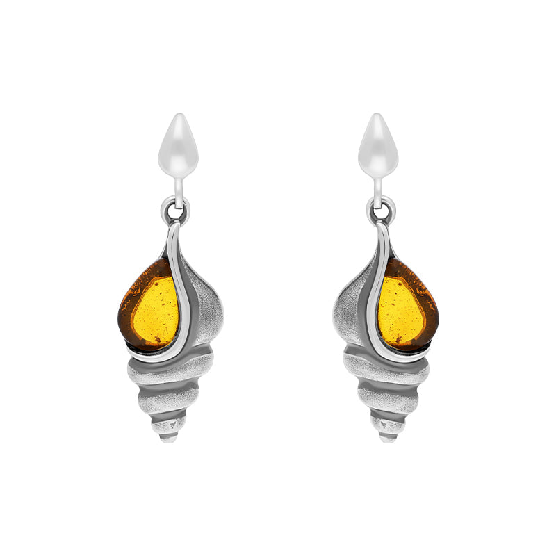 These earrings feature eye-catching pieces of the finest Baltic Amber set into beautifully hand-crafted sterling silver shells on a drop earring feature. Completed with secure sterling silver post and butterfly fittings.