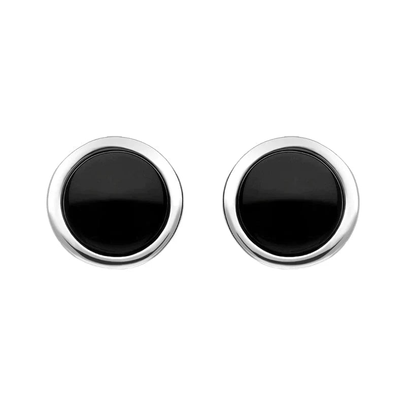 These versatile earrings feature two round shaped cabochons of the finest Whitby Jet, sourced directly from the north east coast of Yorkshire.The stones are framed sterling silver. These simple earrings are perfect for everyday wear and are secured with post and butterfly fitments.
