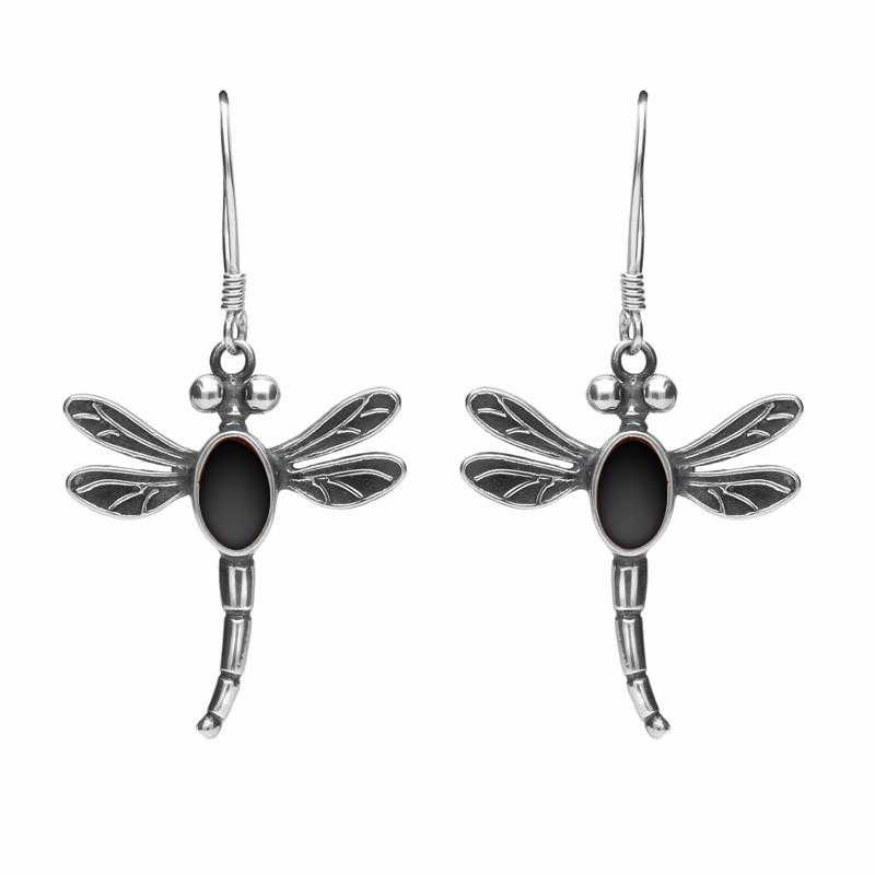 Sterling Silver Whitby Jet Dragonfly Hook Earrings. E1754.