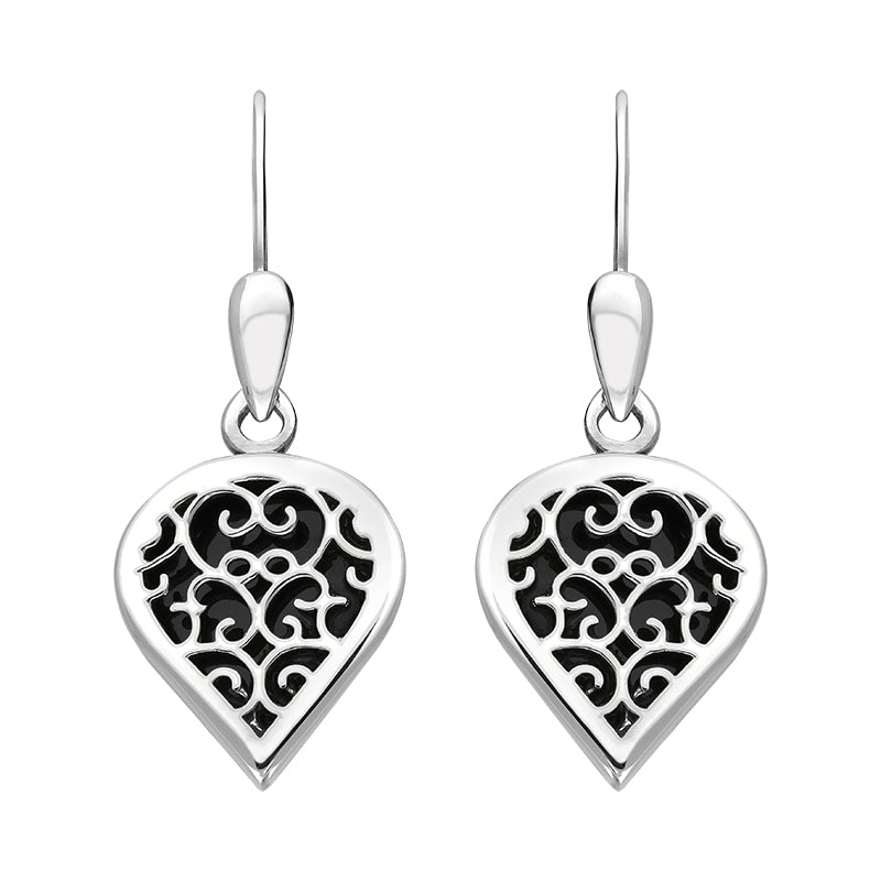 Sterling Silver Whitby Jet Flore Filigree Heart Drop Earrings. E2588.