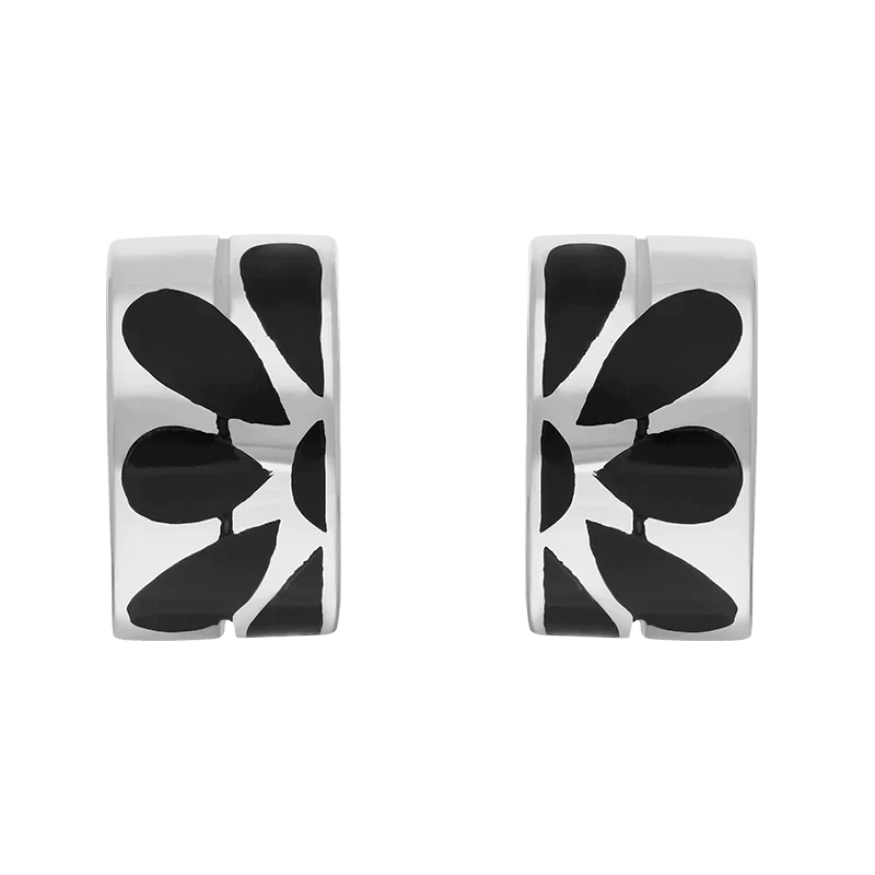 Sterling Silver Whitby Jet Flower Inlaid Wavy Open Hoop Stud Earrings E898