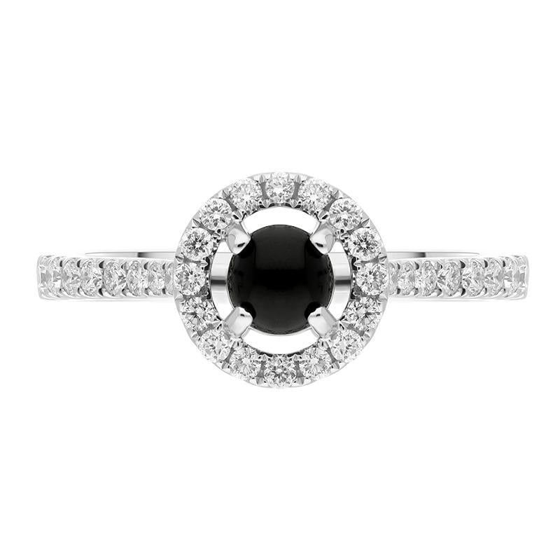 This feminine ring features a round cabochon of rare Whitby Jet stone, directly sourced from the North East coast of Yorkshire. The stone is set in 18ct white gold and surrounded by a sparkling halo of 0.33ct brilliant cut diamonds, which also extend down the shoulders of the classic band.