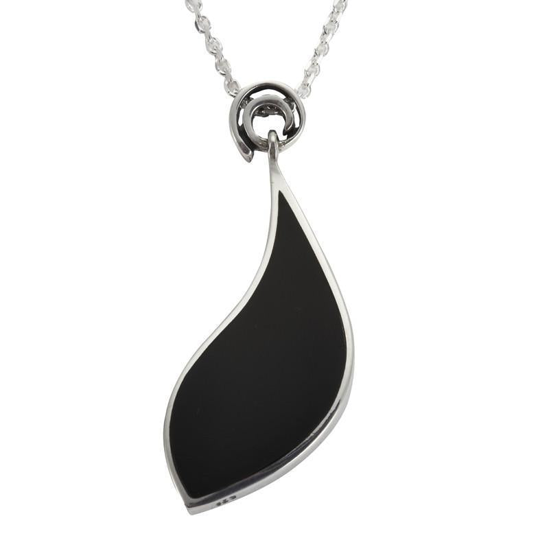 This delicately carved sterling silver and Whitby Jet Acanthus leaf pendant, has been cut and hand-crafted by our skilled jewellery craftsmen to reveal the natural beauty of the Whitby Jet gemstone in a unique and detailed design. The beautiful sterling silver pendant hangs gracefully from a spiral bail on a fluid 18 inch long sterling silver chain complete with a classic bolt ring clasp for easy wear.