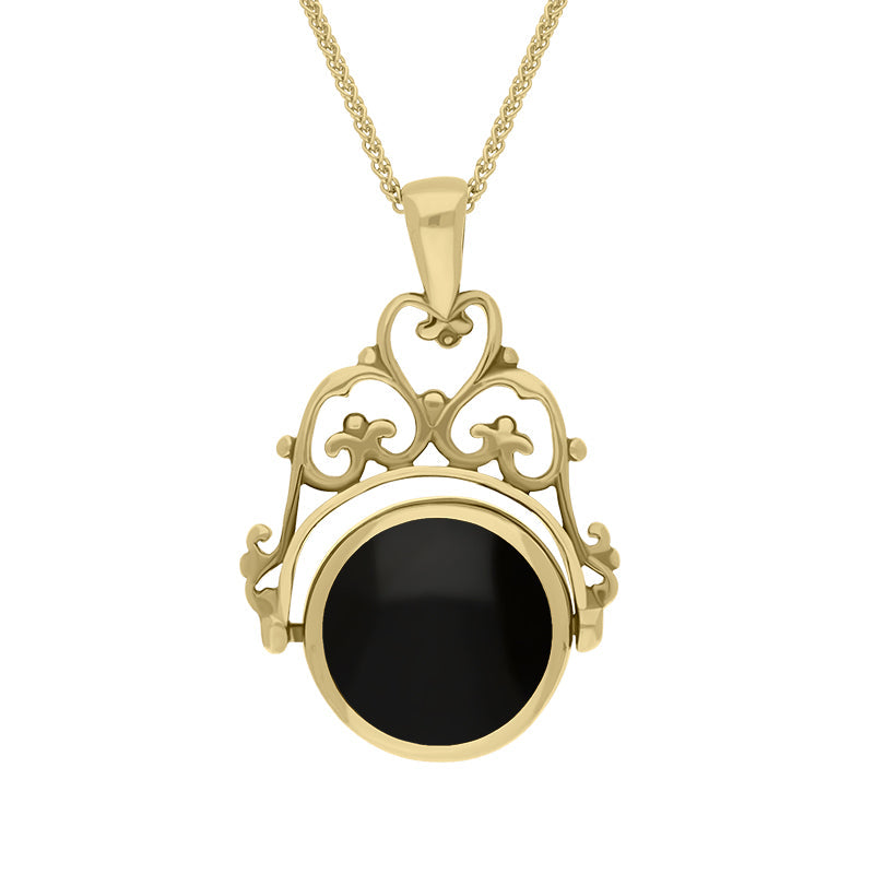 9ct Yellow Gold Blue John Whitby Jet Double Sided Round Swivel Fob Necklace, P110_2.