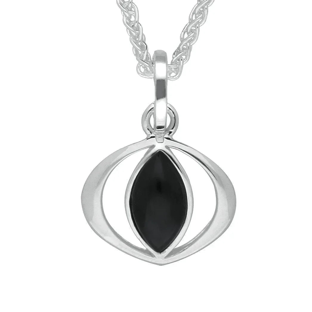 This elegant necklace boasts a stunning marquise shaped cabochon of the finest Whitby Jet stone, sourced directly from the north east coast of Yorkshire. The Jet is set within an exquisite open sterling silver frame for an contemporary finish. The pendant sits gracefully on a 18 inch sterling silver chain which is completed by a classic bolt ring clasp for easy wear.