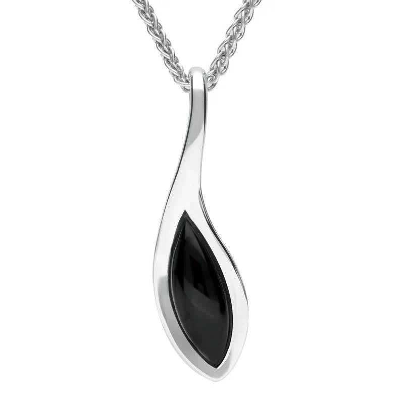 This contemporary necklace features a hand carved marquise shaped Whitby Jet gemstone expertly set in a sterling silver curved drop. Sold complete with an 18 inch sterling silver chain, which fastens with a classic bolt ring style clasp.