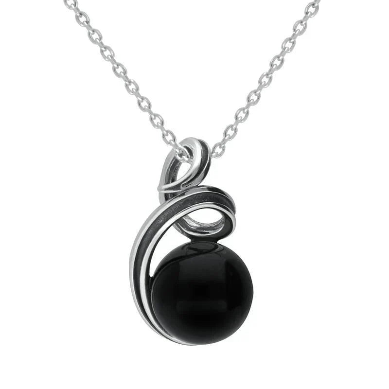 This beautiful necklace includes a perfectly hand carved rounded piece of Whitby Jet, held in an open framework with an by an elegant loop of sterling silver through which passes an 18 inch sterling silver chain.