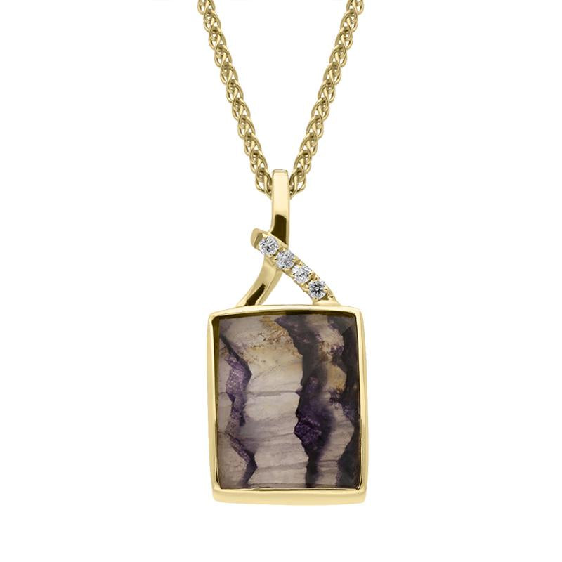 An elegant and unique, faceted rectangular shaped pendant of locally sourced Derbyshire Blue John set in 18ct yellow gold. The pendant has a decorative bail which features four delicately set diamonds, totalling 0.03cts adding extra sparkle and detail, to this stunning piece. The necklace is complete with an 18 inch, 18ct yellow gold chain.