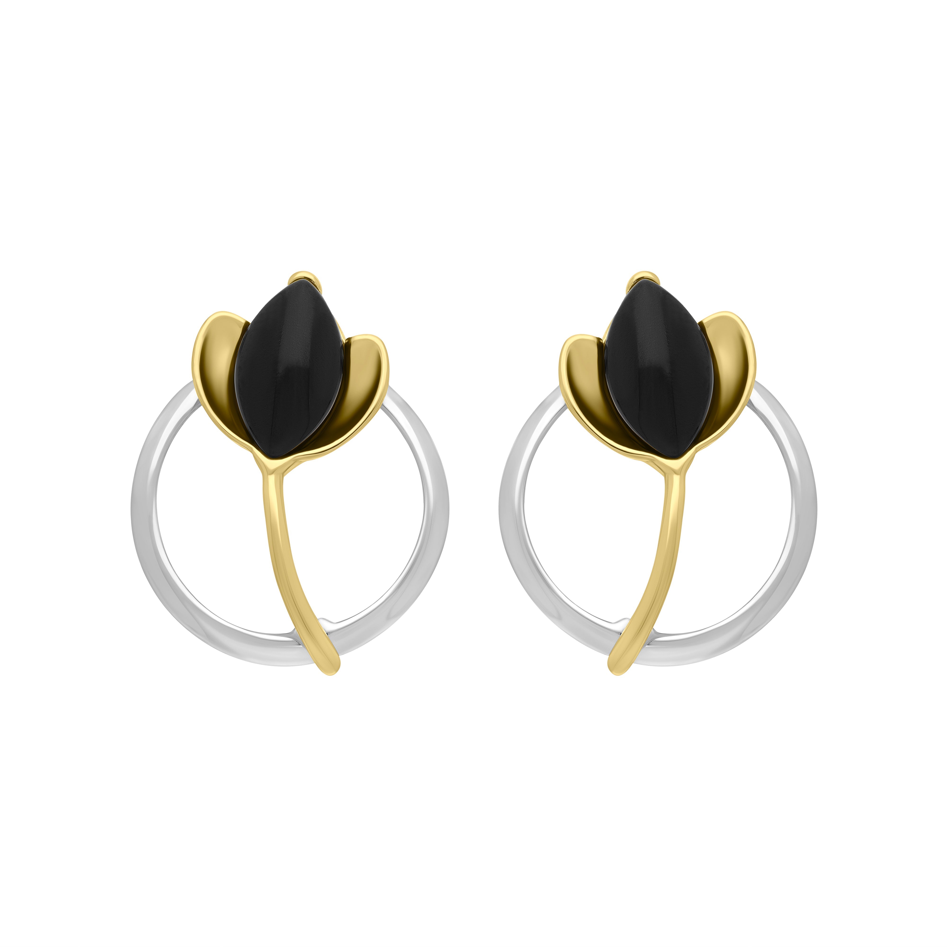 A perfect gift, these earrings feature an open circle design, set with hand carved marquise shaped Whitby Jet gemstones upon the leaf. Complete in a sterling silver design with gold plated detailing for a beautiful contrast.