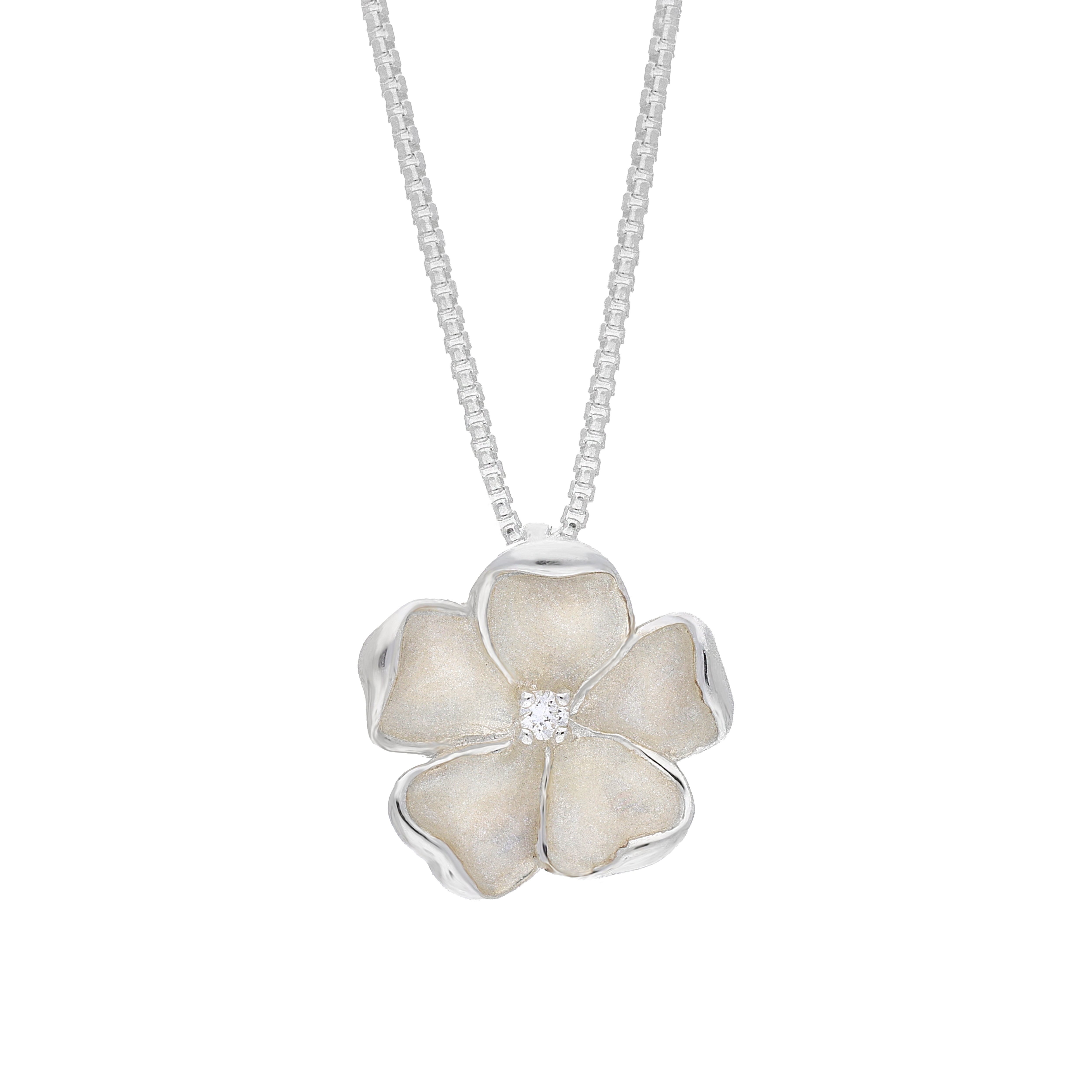 This pendant is crafted with sterling silver and features a beautiful white enamel flower with sparkling diamonds.