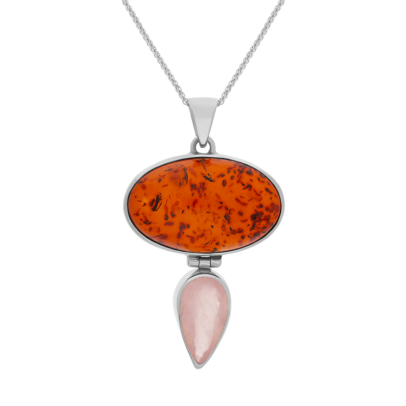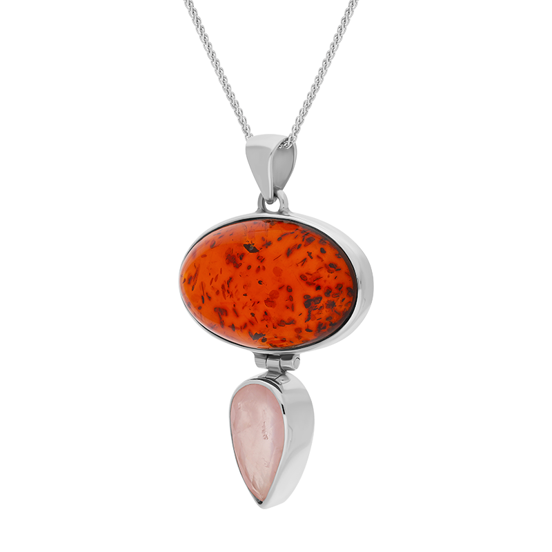 This versatile necklace features genuine Amber and Rose Quartz framed in Sterling Silver. This feminine necklace is perfect for day to evening wear and is presented on an 18'' long Sterling Silver chain with a classic lobster clasp for easy wear.