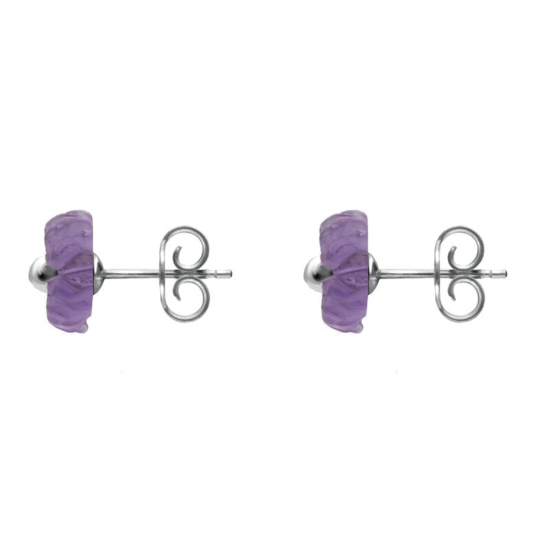 These enchanting earrings are part of our Tuberose handmade jewellery collection and boast delicate hand crafted pieces of Amethyst stone, one of the most valued members of the quartz family, highly esteemed for its beauty and legendary powers to protect and soothe the mind and emotions. The beautiful Amethyst's have been hand carved into a daisy flower design and is completed with a sterling silver post and butterfly fastening. Dimensions: 6mm x 6mm.