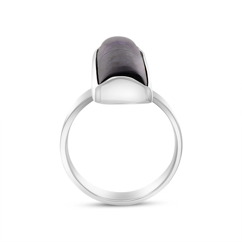 This unique Sterling Silver ring features the finest Blue John gemstone in an abstract curved oblong shape design, creating a stunning contrast against the silver setting making this piece the perfect ring for any gemstone collector.