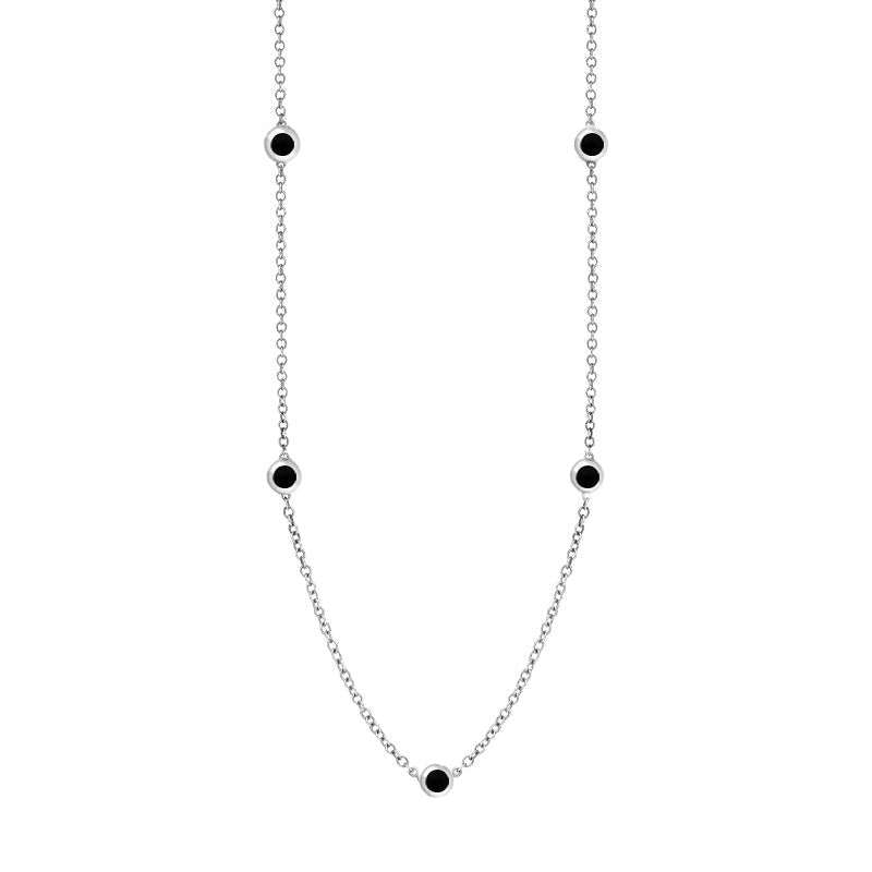 This on trend sterling silver chain necklace features petite discs embellished with heart shaped fine Whitby Jet stones that have been sourced directly from the North East coast of Yorkshire.