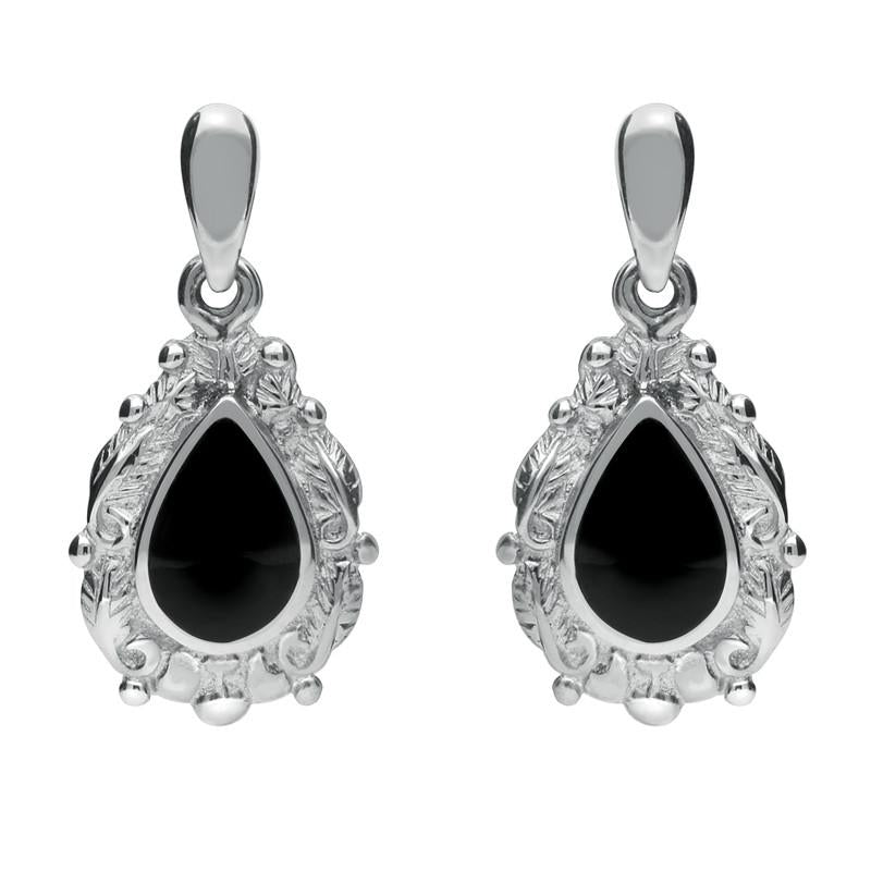Sterling Silver Whitby Jet Pear Shaped Leaf Drop Earrings