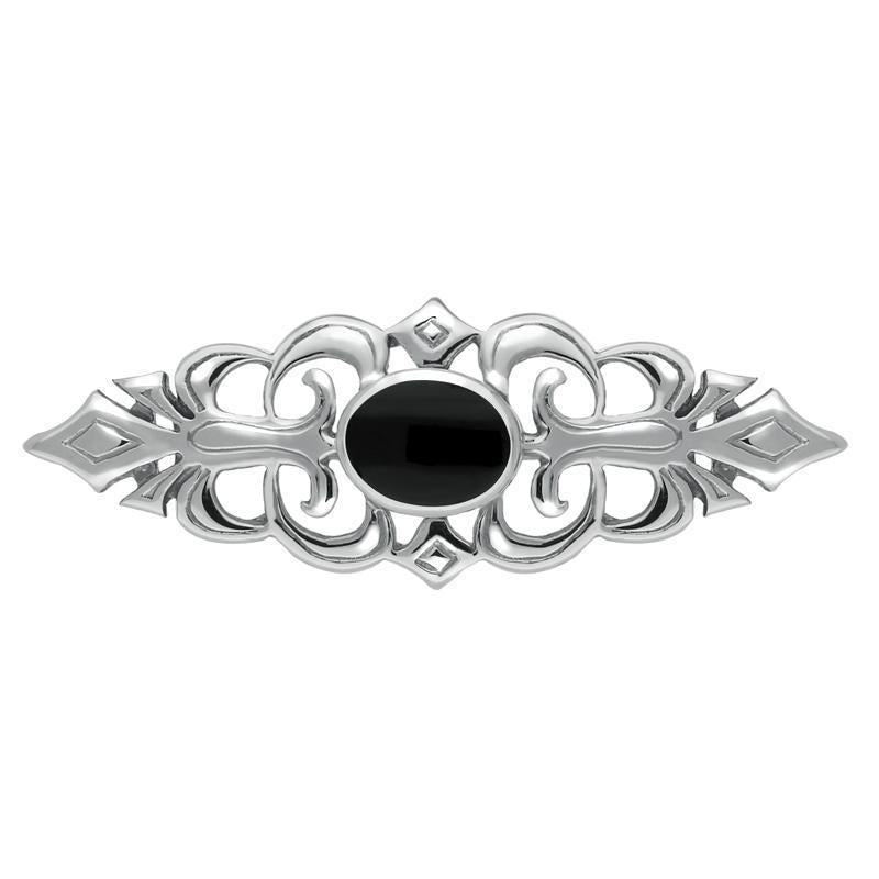 This exquisite sterling silver brooch features a stunning highly polished cabochon of fine Whitby Jet stone which has been sourced directly from the north east coast of Yorkshire. An elegant piece which would make a beautiful addition to any jewellery lover's collection. The brooch fastens with a horizontal bar pin.