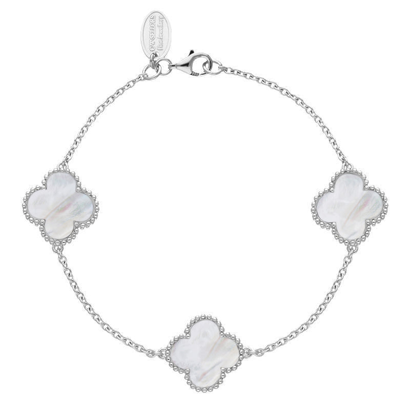 This elegant bracelet features three stunning four leaf clover shaped cabochons of the finest Mother of Pearl. The clover is surrounded with ball detail for a unique, stylish finish. The striking Mother of Pearl forms a stunning combination with the sterling silver 19cm chain, creating the perfect look for every occasion.