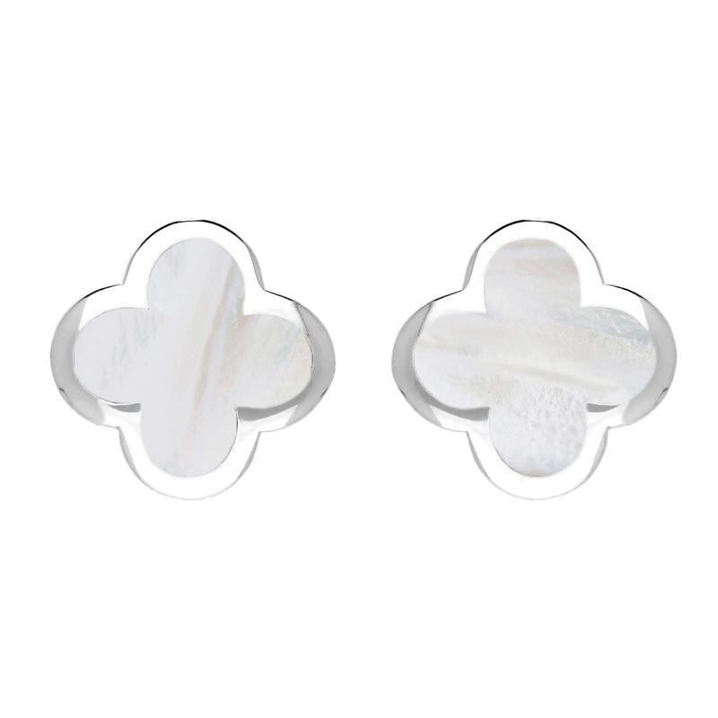 Sterling Silver White Mother of Pearl Bloom Four Leaf Clover Stud Earrings, E2465