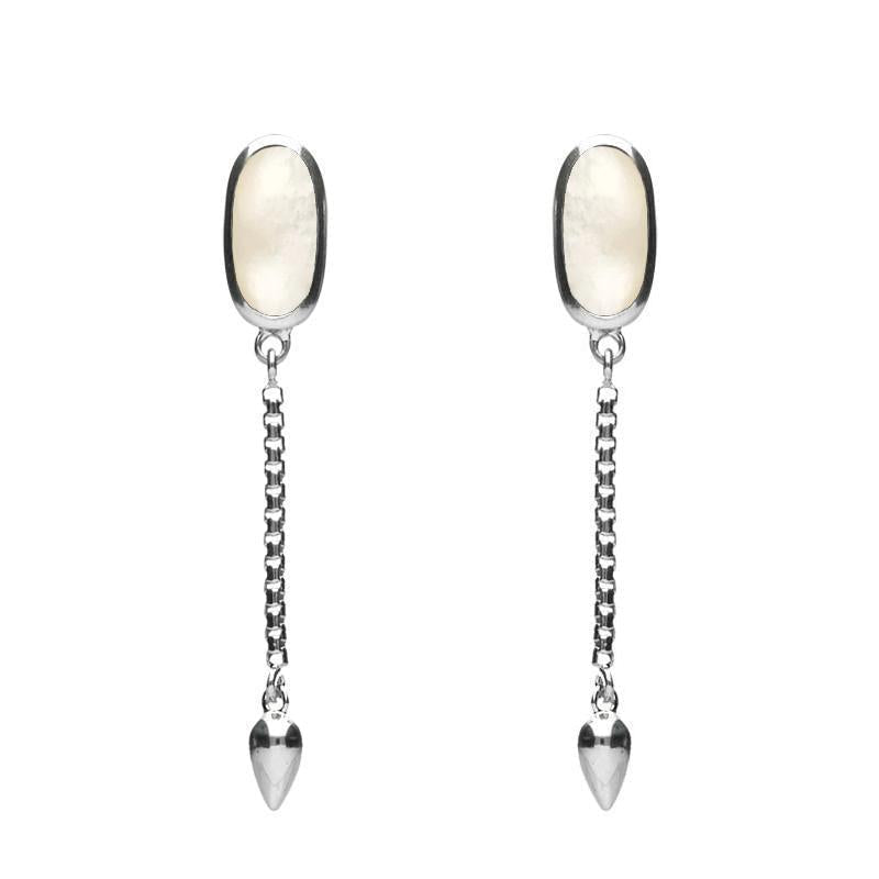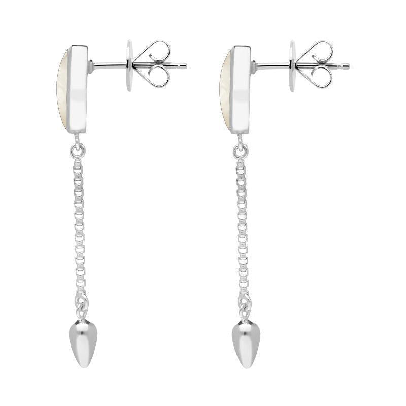These elegant long drop stud earrings feature long, hand cut oval White Mother of Pearl gemstones framed in contemporary sterling silver settings. Fluid 20mm long chains flow from beneath the stones and they are finished with teardrop shaped sterling silver beads. The earrings are completed with classic post and butterfly studs.