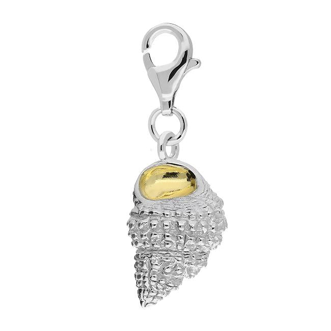 Discover our beautifully crafted charm collection and add to it with this sterling silver and yellow gold plated large ridged conch charm. Completed with a carabina clasp, meaning it will attach to most charm bracelets. Our charms make the perfect gift and become treasured memories for years to come.
