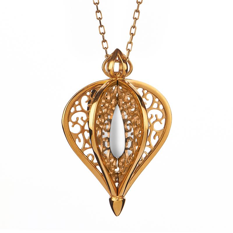 Dimensions: 45 x 28mm. 30" yellow gold plated sterling silver chain.