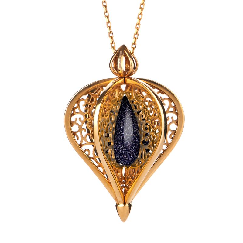 Yellow Gold Plated Sterling Silver Blue Goldstone Flore Filigree Droplet Necklace P2330C