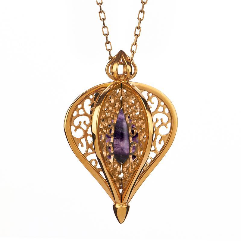This beautiful necklace is part of Rebecca Sellors' Flore collection. The pendant is formed of sterling silver yellow gold plated sterling silver petals with intricate filigree detailing. In the centre is a hand carved and polished Blue John gemstone. The pendant hangs gracefully from a yellow gold plated sterling silver chain which fastens with a classic bolt ring style clasp.