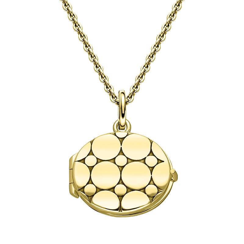With timeless and sentimental value, this contemporary locket makes the perfect keepsake or gift for a loved one, which allows for a treasured photograph to be placed inside and kept close to your heart. Finely handcrafted in sterling silver and yellow gold plated sterling silver, the beautiful oval locket features a dotted design, opens by a small hinge and hangs delicately from an 18 inch yellow gold plated sterling silver chain with a classic bolt ring clasp.